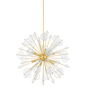 Make a striking statement on the ceiling with this sputnik chandelier. Dozens of clear ribbed or clear swirled glass orbs are suspended on slender rods bursting from an Aged Brass center orb. This modern design catches the eye unlit and puts on a dazzling display when illuminated.