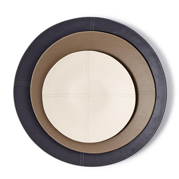 Elevate your tabletop display with the luxurious Lorenzo set of 3 faux leather bowls in sophisticated black, warm camel, and neutral linen hues. You will notice great attention to detail on these hand made bowls with a contrasting stitch design. Each piece enjoys a soft leather like feeling and is lined with a sumptuous velvet bottom. These stunning trays add a touch of elegance to any space. Handmade with care, each bowl showcases exquisite craftsmanship and attention to detail.