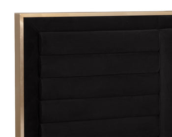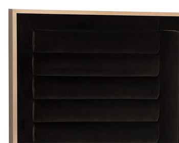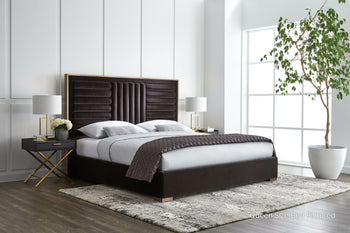 This richly designed bed will add warmth to any bedroom space. Upholstered in our abbington charred brown fabric with horizontal and vertical tufting on the headboard. Finished with antique brass steel feet. No box spring is required and folding slats are included. Due to the reflective nature of metal, some images on our website may not capture the artisanal characteristics of a product accurately.