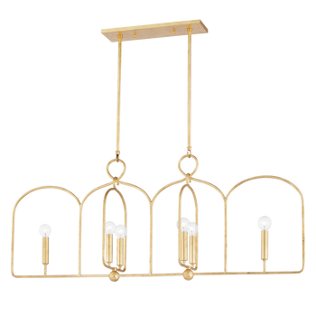 With its open, arched metal frame and gold leaf or aged iron finish, Mallory makes a stylish statement. Clear, round bulbs atop sleek, straight candle holders create a beautiful contrasting effect. Available as a sconce, pendant or linear, each fixture hangs from a round metal loop giving the piece a feeling of motion.
