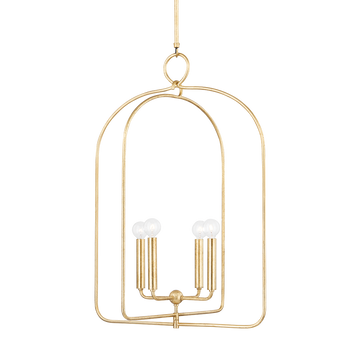 With its open, arched metal frame and gold leaf or aged iron finish, Mallory makes a stylish statement. Clear, round bulbs atop sleek, straight candle holders create a beautiful contrasting effect. Available as a sconce, pendant or linear, each fixture hangs from a round metal loop giving the piece a feeling of motion.