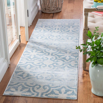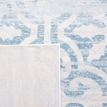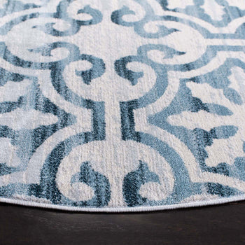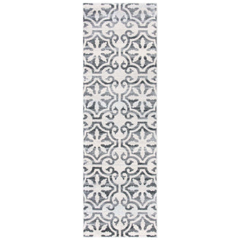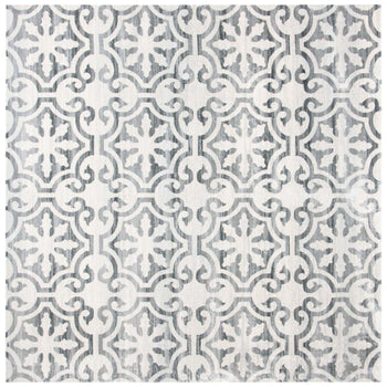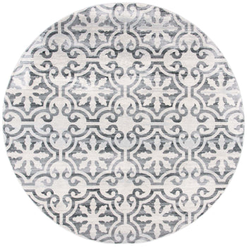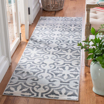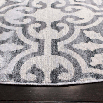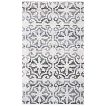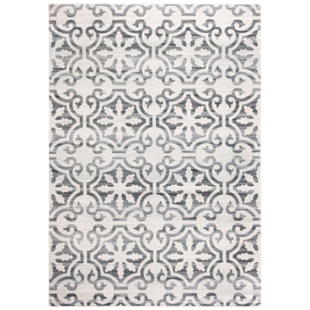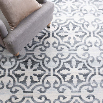 What sets this rug apart is its stunning grey and ivory color palette, seamlessly blending into both modern and traditional decors. The pattern, as observed in the image, showcases an elegant display of transitional motifs, offering a timeless appeal that gracefully complements various interior designs.