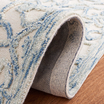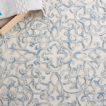 Elevate your living space with our exquisite Hand Tufted Wool Accent Rug, crafted with care in India. This charming 2' X 3' rug, with a pile height of 1/4", features an alluring blue and ivory color palette that adds a splash of elegance to any room. The traditional style pattern, composed of intricate florals and curvilinear motifs, brings classic sophistication and timeless appeal.