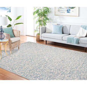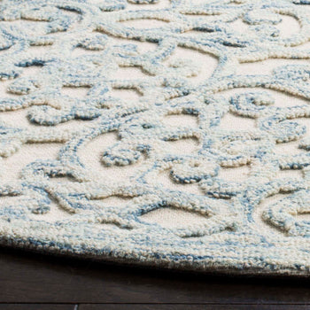 The subtle blend of blue and ivory hues in this accent rug draws inspiration from vintage designs, seamlessly integrating with both modern and traditional decor. Its compact size makes it a versatile addition to any space in need of an extra touch of coziness and charm. Indulge in the comfort and beauty of our Hand Tufted Wool Accent Rug, and infuse your home with the artistry of Indian craftsmanship.