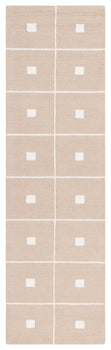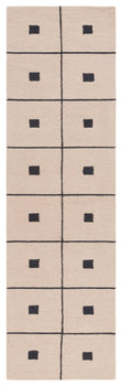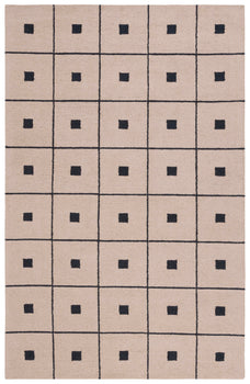 The rug's beige and black color palette exudes a warm, neutral charm that complements various interior designs, from modern minimalist to more classic aesthetics. Its geometric style, featuring a smart arrangement of black squares on a grid across a beige backdrop, offers a chic and structured visual appeal that anchors your furniture and decor.