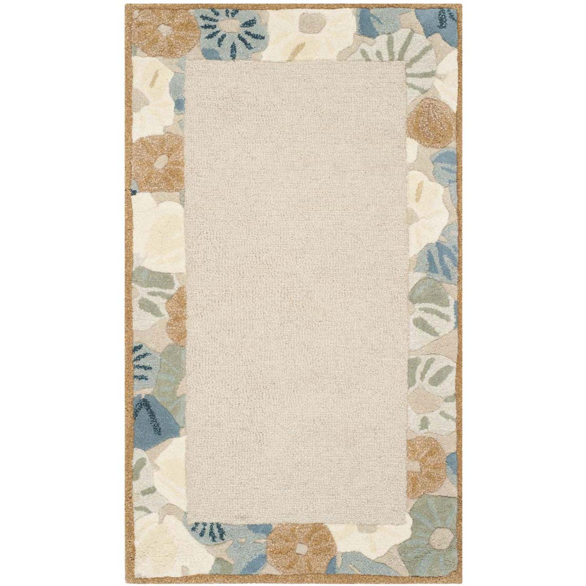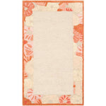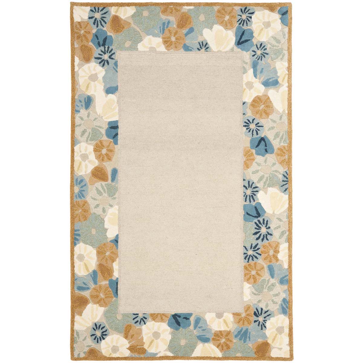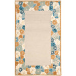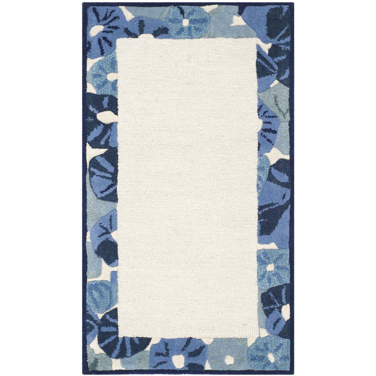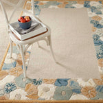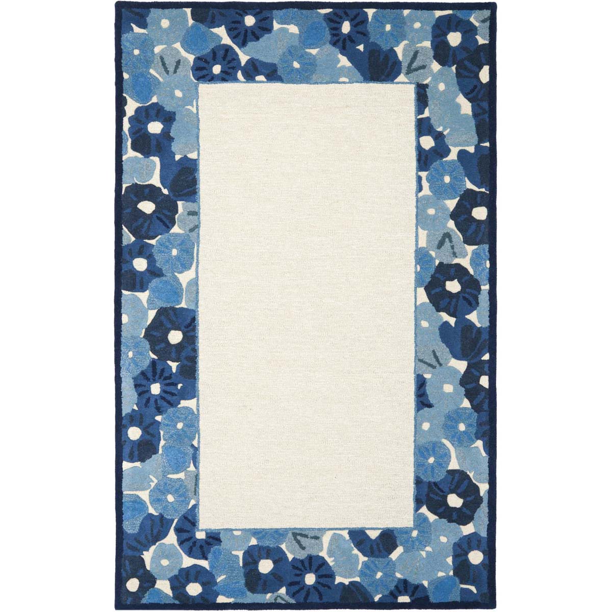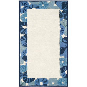 Taking a closer look at the rug's design through the provided image, we notice a bold and dynamic leaf pattern border that delicately frames a clean, neutral center. This artful pattern showcases a beautiful play of blues ranging from deep navy to lighter tones, creating a striking contrast that will draw the eye and anchor your room's decor.