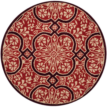 The rug's pattern radiates elegance and rich heritage. It features an ornate floral and geometric design, with bold lines and intricate motifs that capture the eye and heart. The exquisite contrast of the vermillion backdrop with lighter detailing creates a captivating visual narrative, making this wool rug not just a home accessory but a piece of art.