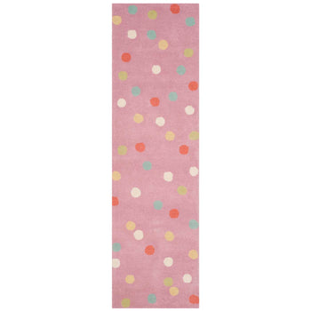 Featuring a heartwarming carnation pink background, our runner is dotted with a colorful array of polka dots in soft pastels and warm hues that evoke a sense of comfort and happiness. The artful placement and varied sizes of the dots create an engaging pattern that adds depth and character to any room.
