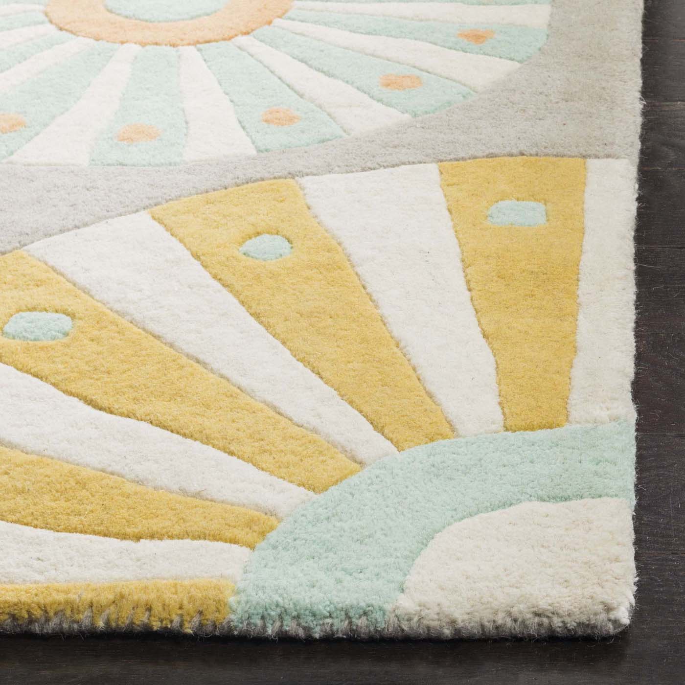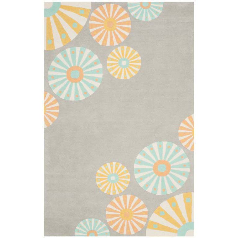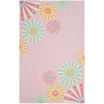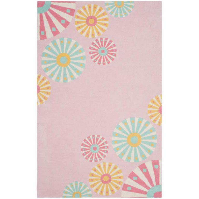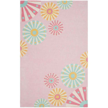 This small rectangular rug is skillfully made in India, featuring an array of radiating circular patterns that imbue any room with a lively and inviting atmosphere. The playful mix of soft pink, soothing turquoise, zesty yellow, and splashes of warm coral set against the rug?s carnation background evokes the freshness of a blooming garden.