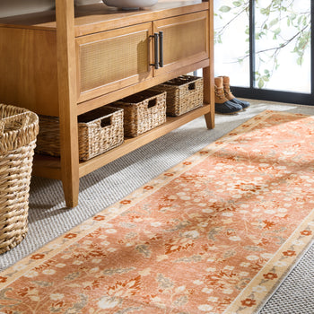 Introducing a stylish addition to your home decor, this traditional runner rug is crafted with care in China. Measuring 2 feet 6 inches by 8 feet, it fits perfectly in hallways or long spaces, adding a touch of elegance with its rust and beige hues. The rug features a sleek 1/8 inch height, providing a smooth transition between surfaces.
