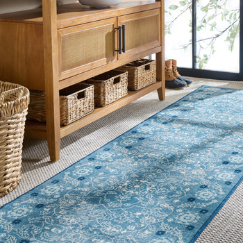 Introducing our contemporary runner rug, a blend of tranquil blues and soothing beige tones designed to complement and elevate any space. Sized at a versatile 2 feet 6 inches by 8 feet, this runner is perfectly suited for hallways, kitchens, or any area that can benefit from a touch of elegance and color.