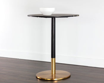 A round bar table inspired by Art Deco luxury. Features a matte black marble top with striking gold and white veining and a black and gold steel base. Perfect for small kitchen and dining spaces. As marble is a natural material, unique veining, pitting, fissures, micro-cracks and colour variations are all characteristics that add to the uniqueness and beauty of each piece.