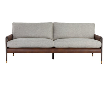 With influence from vintage design, this sofa evokes a charming and rustic mid-century appeal. Upholstered in vault fog performance fabric with accenting bravo cognac faux leather. Features dual buckle flap detailing on the armrests and completed with a brown solid oak wood frame with gold finished metal foot caps. Performance fabric is moisture repellent, durable and easy to clean.