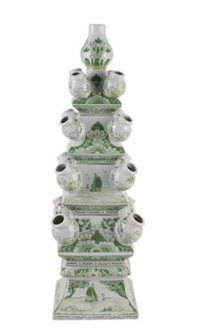 Capture the essence of timeless elegance with our Green and White Tulipiere. Each piece is a masterpiece of craftsmanship, adorned with delicate green and white hand-painted village scenes that wrap around the entire body of the tulipiere. Perfect as a standalone statement piece or paired with its companions, this tulipiere is composed of four separate pieces.