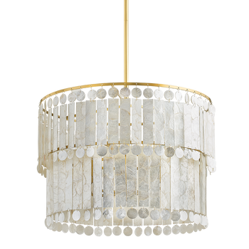 Gorgeous layers of Capiz shell, in alternating circles and rectangles, dangle from an Aged Brass frame for a sophisticated coastal aesthetic. This stunning design, available in a small and large chandelier, is the perfect centerpiece for your bedroom or living room update. Part of our Megan Molten x Mitzi Tastemakers collection.