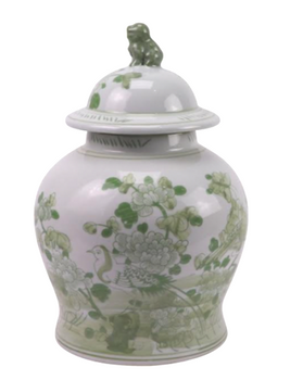 Introducing our Mid-Sized Green Floral and Bird Jar, a must-have for any elegant space. Admire the charming foo dog lid, the chunky shape, and the classic bird and floral scene.
