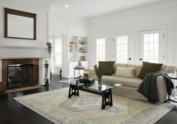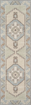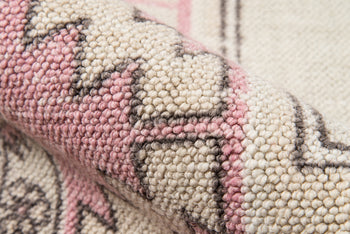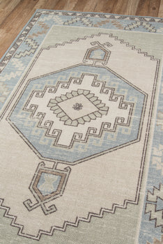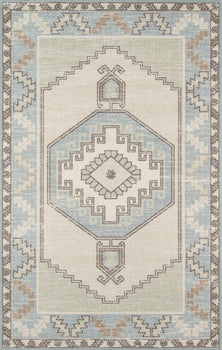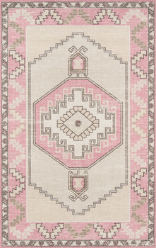 SOFT TRIBAL LOOK: The pastel color palette of Anatolia presents a softer side of tribal styles. Subdued shades of pink, baby blue and brown fill the field and ornamental rug borders with classical medallions and vine and dot motifs.