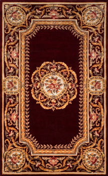 The antique-style embellishment of this traditional area rug adds ornamental flourish to floors throughout the home. Available in royal shades of sage green, soft blue, ivory, rose and regal burgundy red, the ornate gold scrolls and scallops of each decorative floorcovering reflect the gilded grandeur of French baroque style. Hand tufted from 100% natural wool fibers, the curling vines and lush floral bouquets of the borders are hand carved for exquisite depth and dimension.