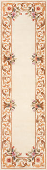 The antique-style embellishment of this traditional area rug adds ornamental flourish to floors throughout the home. Available in royal shades of sage green, soft blue, ivory, rose and regal burgundy red, the ornate gold scrolls and scallops of each decorative floorcovering reflect the gilded grandeur of French baroque style. Hand tufted from 100% natural wool fibers, the curling vines and lush floral bouquets of the borders are hand carved for exquisite depth and dimension.