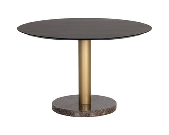 This dining table collection offers a modern look with an organic feel. Features a substantial light grey marble and brushed gold iron base with a charcoal grey finished oak wood veneer top. As marble is a natural material, unique veining, pitting, fissures, micro-cracks and colour variations are all characteristics that add to the uniqueness and beauty of each piece. As wood is an organic, porous material, these pieces will contain natural variation of texture and may also exhibit fine indentations and cracks. Wood pieces will also display a disparity of colour and grain, and visible knots and burls that add to the character of each piece.