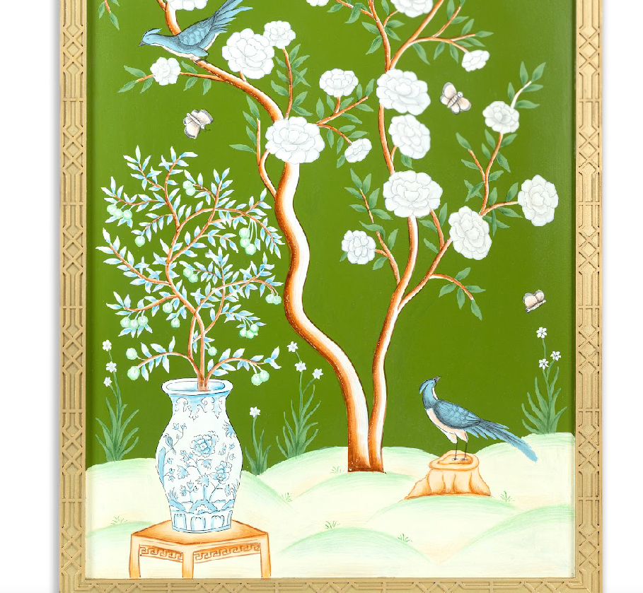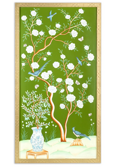 Elevate your space with the timeless elegance of chinoiserie hand-painted murals. Each mural is meticulously hand-painted by skilled artisans, capturing the intricate details and rich colors characteristic of the chinoiserie style. The design often features delicate floral patterns, serene landscapes, and intricate motifs inspired. Whether depicting graceful birds perched among lush foliage or tranquil scenes of nature, these murals are crafted to transport you to a world of beauty and refinement.