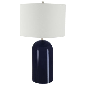 This beautiful dome shaped ceramic table lamp is finished in a navy blue with brushed nickel accents. A white linen round hardback shade completes the look and is perfect for your coastal hideaway.