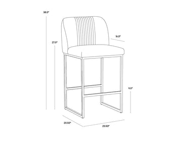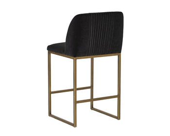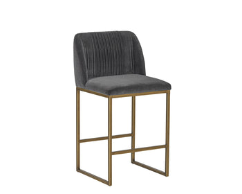 A modern counter stool that offers style and comfort. Features delicate ruching on the rounded seatback and exposed antique brass legs. Stocked in shadow grey fabric. Suitable for various dining, kitchen and bar spaces of all sizes.