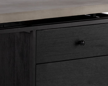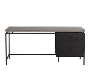 Mixed materials come together to construct a fascinating desk. Featuring a thick grey concrete top, a black metal frame and pine wood drawers in a coffee bean finish. As wood is an organic, porous material, these pieces will contain natural variation of texture and may also exhibit fine indentations and cracks. Wood pieces will also display a disparity of color and grain, and visible knots and burls that add to the character of each piece. Crafted from a natural concrete mix, each piece will look different. Variations in color, texture, imperfections, surface scratches and non-structural hairline cracks are considered inherent and valued qualities of the material.