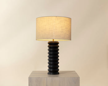 Organic shapes descend in a cylindrical form to create the Oletto Table Lamp. Made from black mango wood and topped with a cream linen shade, this piece features grooves and ridges for a tactile touch.