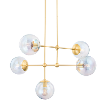 Ophelia is forward-thinking and fun. The combination of aged brass and iridescent glass globes is otherworldly, lending a softness to the wall sconce, island light, and chandelier.
