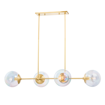 Ophelia is forward-thinking and fun. The combination of aged brass and iridescent glass globes is otherworldly, lending a softness to the wall sconce, island light, and chandelier.