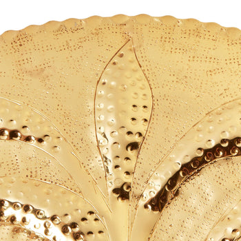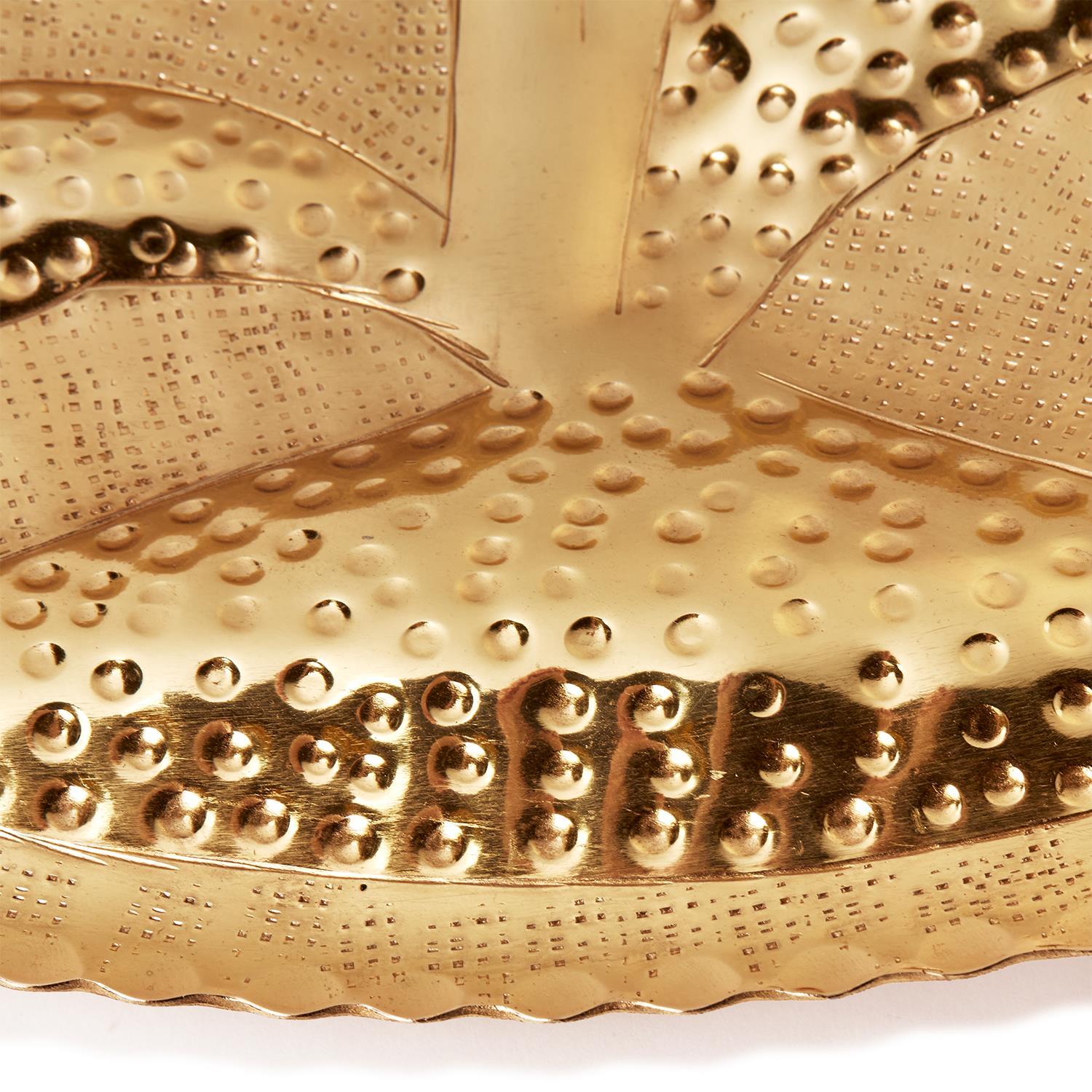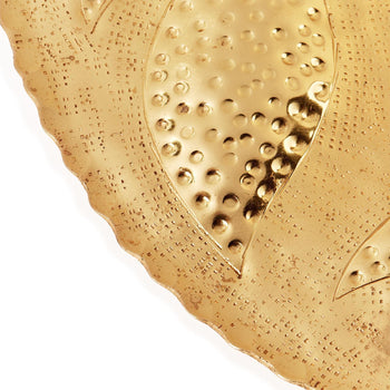This stunning set of round trays make an elegant and rich statement with its 3-dimensional floral pattern design. Crafted in recycled aluminum, each has an elegant shiny golden patina that shows off just perfectly the hammered texture on the surface. Hanging on a wall or sitting decoratively on a cocktail table they are sure to be a favorite home accessory.