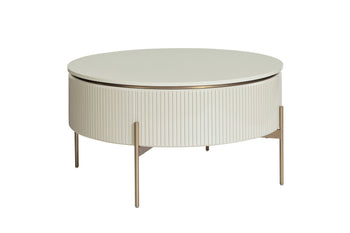 This luxurious lift-top coffee table will bring a sculptural spirit to any space. The curved frame, finished in high gloss cream, is contrasted with intricate vertical reeding. Gold stainless steel legs and inlay create added definition. Coordinating end table and sideboard also available.