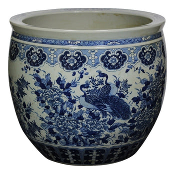 This beautiful fishbowl is simply stunning. Beautiful peacock and floral design is hand painted on the entire body of the fishbowl. Perfect for both indoor and outdoor settings, it's ideal for housing small trees or plants.