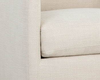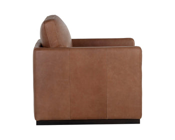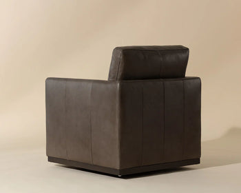 A robust swivel lounge chair. The modern design features a streamlined silhouette with track arms. Stocked in marseille concrete and camel leather. As this piece features feather-filled cushions, occasional rotation and fluffing is required to maintain its lasting comfort and beauty. Visit our Product Care page for more information. Handle with Care: This design has been crafted with 100% buffalo leather. Leather is a natural material; as such, colour variations, markings, wrinkles, grooves and light scratches are acceptable and appreciated characteristics. No two pieces are alike. Visit our Product Care page for more information on how to ensure the lasting beauty of this piece.