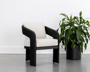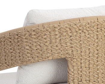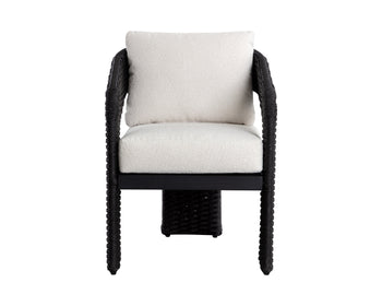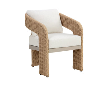 The geometric curves of the Pylos Dining Chair will effortlessly stand out in any outdoor area. Twisted wicker in a natural finish wraps around an aluminum frame for a defined, textured look. Soft cushioning in our louis cream outdoor boucle performance fabric completes the design.