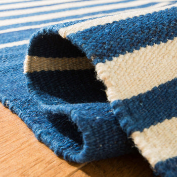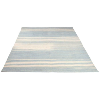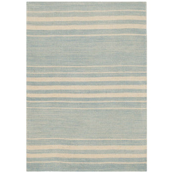 Introducing our exquisite handwoven wool accent rug, a testament to the timeless craftsmanship of India. With dimensions of 2' X 3' and a comforting 1/4" pile height, this piece is an ideal addition to any space that demands a touch of elegance. The sky blue hue of this rug, paired with serene cream stripes, evokes the tranquility of a clear day and complements a variety of interior decors.