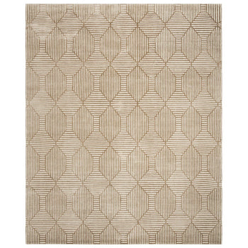 Introducing our exquisite 2' x 3' hand-knotted accent rug, a seamless blend of luxury and durability. Crafted with the utmost precision in Nepal, this rug features a sophisticated camel color that exudes timeless elegance. With a composition of 56% wool and 44% silk, it promises a plush feel underfoot and a subtle sheen that enhances its intricate geometric pattern.