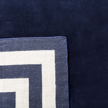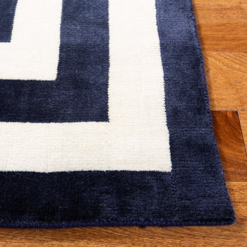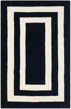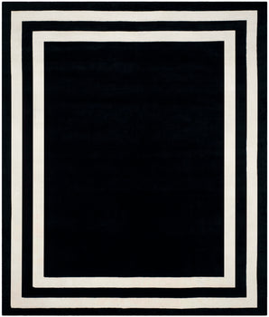 Elevate your space with the timeless elegance of our hand-knotted wool area rug, meticulously crafted in India. This exquisite accent rug, with a modest pile height of 1/4", boasts a sumptuous jet black base, framed by a sophisticated geometric border pattern in a contrasting hue, adding depth and dimension to any room.