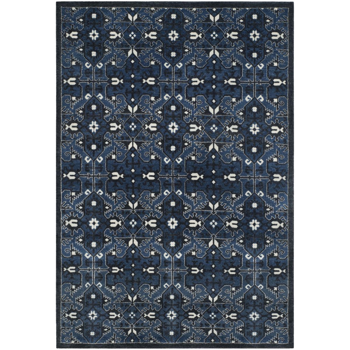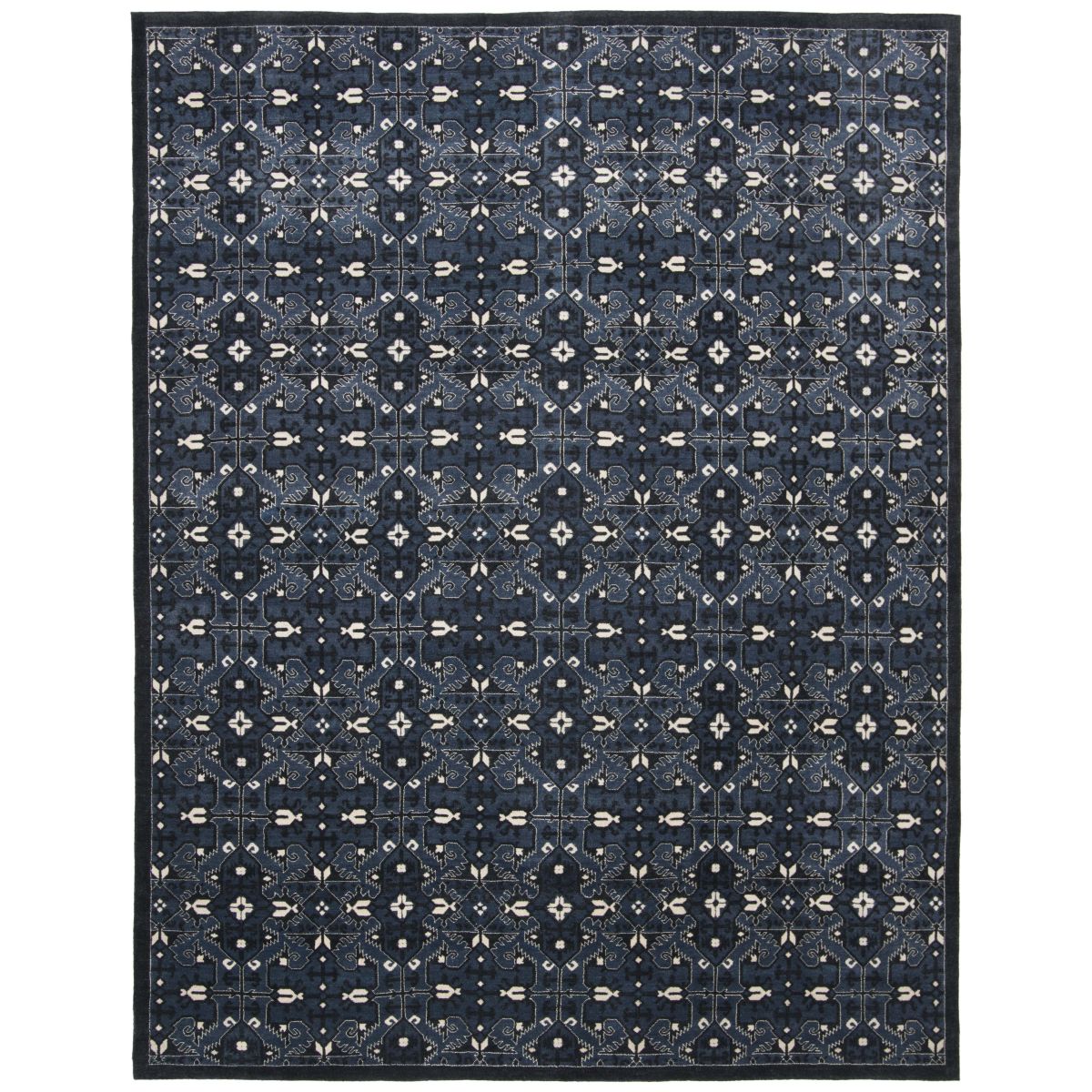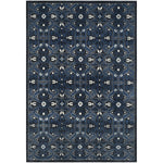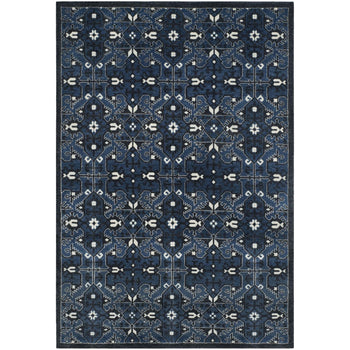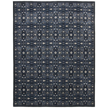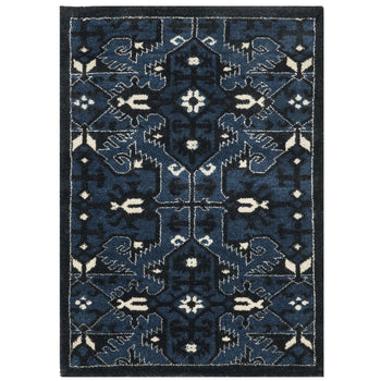 The rug features an intricate pattern, a captivating dance of traditional motifs that speak of heritage and sophistication. Its deep blue hues are accented by contrasting designs, striking a balance that's both bold and harmonious. Whether gracing your foyer, bedside, or office, this piece serves as an exquisite focal point or a subtle complement to your decor.