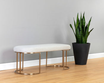 An elegant bench designed with soft, textured belfast oatmeal fabric and an exposed antique brass stainless steel frame. Can be paired with coordinating dining chair and dining armchair.