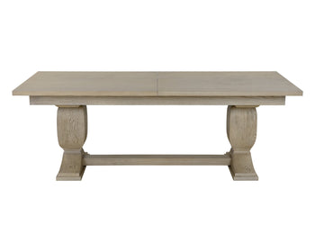 Inspired by architectural shapes and classic design, the Rhaenyra Extension Table brings an elegant presence to any dining space. Crafted from sand beige oak veneer with distinct graining across the base. As wood is an organic, porous material, these pieces will contain natural variation of texture and may also exhibit fine indentations and cracks. Wood pieces will also display a disparity of colour and grain, and visible knots and burls that add to the character of each piece.