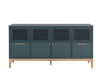 With a timeless design, the Rivero Sideboard is a delightful addition to any space. Crafted with a teal oak veneer for a subtle pop of colour, and complemented with a light wash rubberwood base. Includes ample storage with metal hardware in a gold finish. As wood is an organic, porous material, these pieces will contain natural variation of texture and may also exhibit fine indentations and cracks. Wood pieces will also display a disparity of colour and grain, and visible knots and burls that add to the character of each piece.