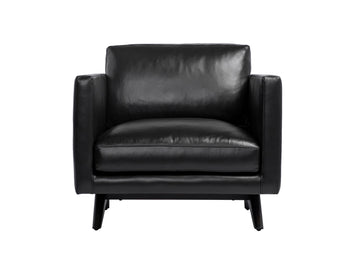 A stylish, retro-inspired armchair. The masculine design features a comfortable seat in cortina ink leather with dark brown solid oak wood legs. Coordinating sofa also available. Handle with Care: This design has been crafted with 100% genuine leather. Leather is a natural material; as such, colour variations, markings, wrinkles, grooves and light scratches are acceptable and appreciated characteristics. No two pieces are alike. Visit our Product Care page for more information on how to ensure the lasting beauty of this piece.