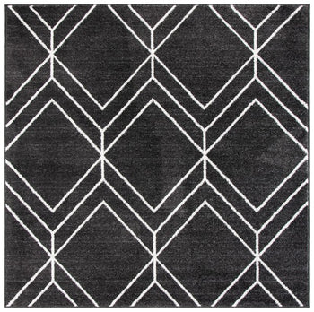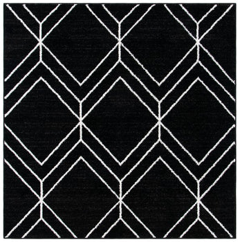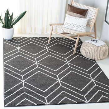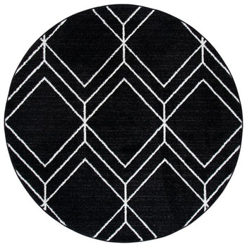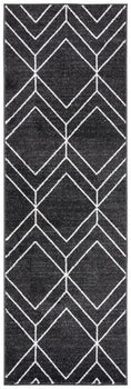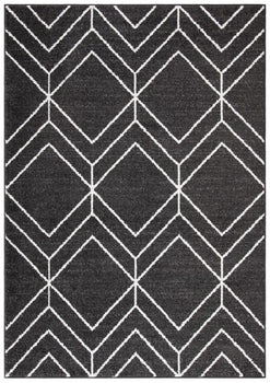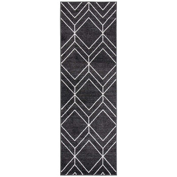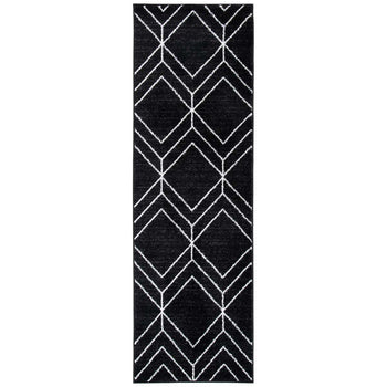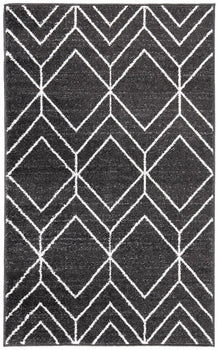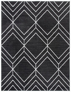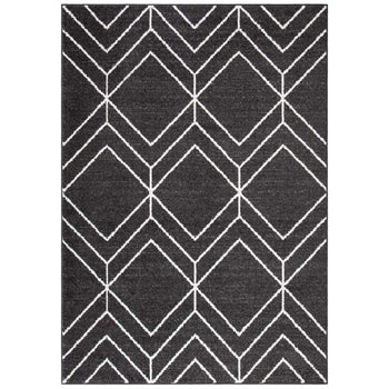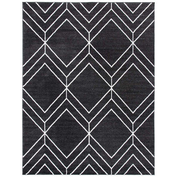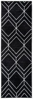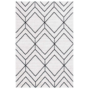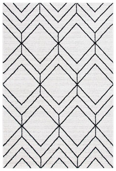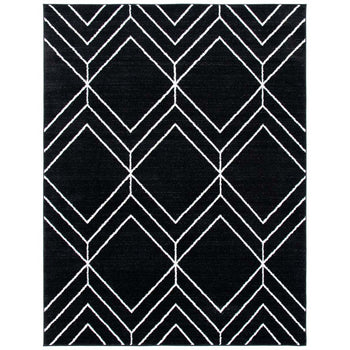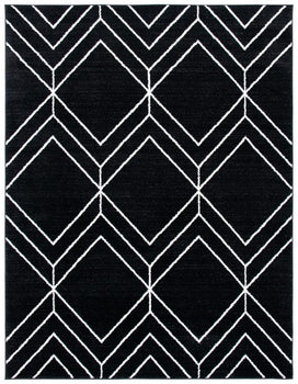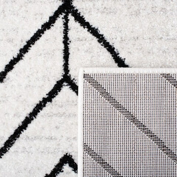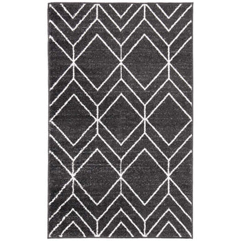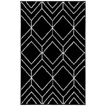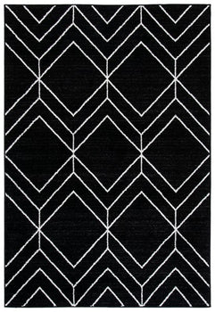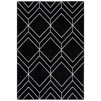 Introducing our contemporary accent rug, measuring 2'-6" by 4' with a comfortable 3/8" pile height, perfect for adding a touch of sophistication to any room. This rug showcases a striking black and ivory geometric pattern that will effortlessly complement your modern decor. Expertly crafted in Turkey using a power-loomed technique, this rug boasts a durable blend of materials with 55% polypropylene, 40% jute, and 5% polyester, ensuring longevity and ease of maintenance.