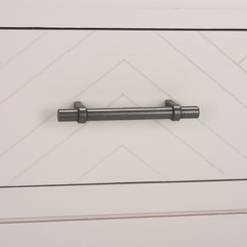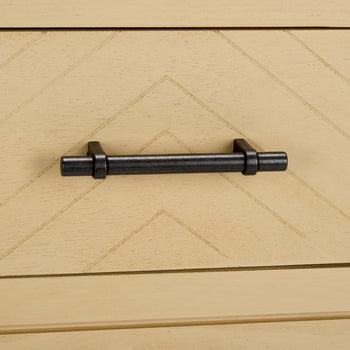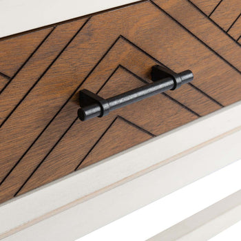 This Ajana Console is a marvelous m'slange of modern minimalism and abstract art. Ajana's clean lined Parson's frame in distressed white is beautifully offset by the honey brown herringbone inspired chevron pattern on its two drawers.