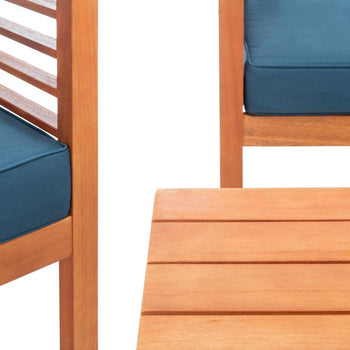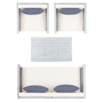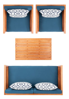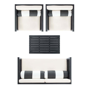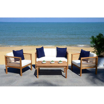 Inspired by Barcelona's coastal style, this contemporary 4 piece outdoor set is a new classic. Designed with chic clean lines, each piece is crafted in a neutral natural hue and upholstered in white for timeless appeal. Its bold navy accent pillows are complementary.