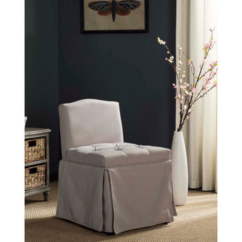 The ultimate luxury, this designer vanity chair is upholstered in taupe linen fabric with all the elegant touches of a custom piece. Biscuit button tufting adds drama to the rolled edge backrest, while a full ruffled skirt lends an air of romance.