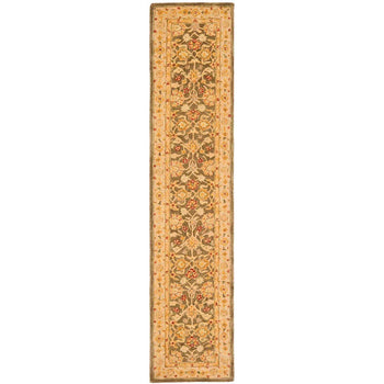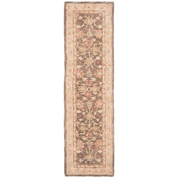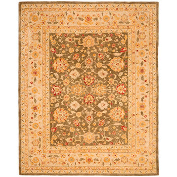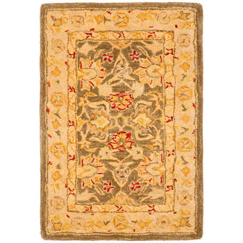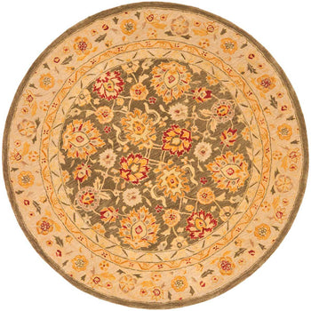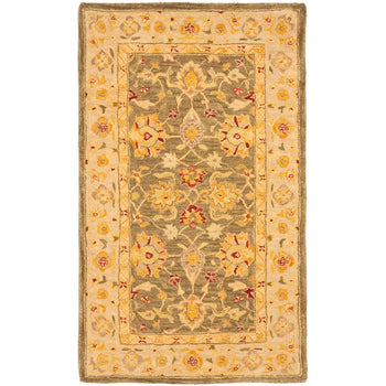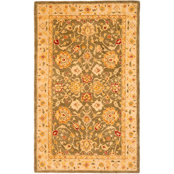 The rug showcases a traditional aesthetic with a timeless pattern composed of elegant floral motifs and intricate vines, accented with hints of rich reds and soft yellows set against a harmonious olive grey background. The beige border frames the design, creating a classic look that complements both modern and traditional interiors.