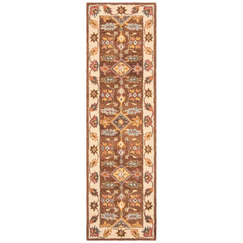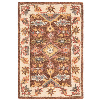 The rug's base color palette comprises a deep, rich dark brown, contrasted beautifully with ivory accents that highlight its intricate design. Upon closer inspection, the majestic pattern reveals an array of floral and geometric motifs, reminiscent of classic artisanal creations from India. This unique piece showcases a central diamond-shaped medallion surrounded by symmetrical patterns, lending it a sense of balance and harmony that is both striking and inviting.